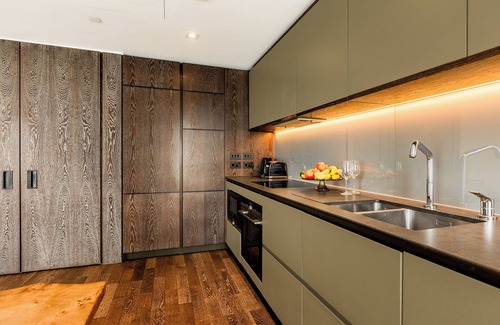 - This modern apartment benefits from an open plan kitchen reception with integrated appliances.