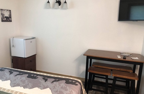 Start your day refreshed after staying in one of our Budget Friendly Rooms in Building A. The room has 1 queen size bed. The property has a private bath with a shower. Linens, towels, pillows, and comforters are included in this overnight rental. There is a common kitchen area for shared use in the lobby of Building A where your room is located. The shared kitchen has very basic cooking supplies. The rental has a smart TV as well.