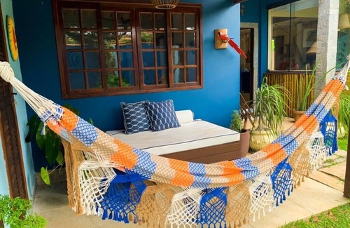 Large, airy house, all decorated, very cozy, practical, surrounded by green, Buzian style excellent and quiet location on the main street of Bosque de Geribá. Total privacy, just minutes from the right corner of Geribá beach and Manguinhos beach. Prolagos water (20 thousand liter cistern). Very spacious balcony, covered barbecue, land of 1200 m2 all walled and lawn. Football court, parking for 3 cars, beautiful garden, fruit trees and swimming pool. Large suites, comfortable living room, TV and ceiling fan, dining room with table for eight, American kitchen, total of 4 full bathrooms. Maximum of 10 people (including children). Air conditioning in all suites.