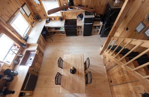 Please note that the cabin has an open space design, with three beds (one king and two twins) in the loft upstairs and two futons on the main floor.