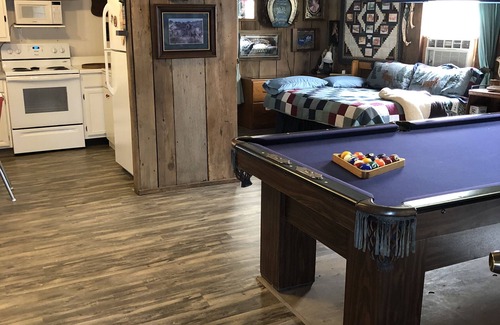 Cabin on the lake with 2 piers. 1 has a slide and 2 diving boards. The Cabin has a king bed and 2 queen beds, 2 full bathrooms and a full kitchen. We have a pool table, dart board, corn hole boards , ladder ball and kayaks for your use. We have a private boat ramp and plenty of parking for boats and trailers. We also live on the property in a separate residence, we offer no contact check in and we do not bother you unless you need something from us. The cabin is located above the the main house due to the flood plain.