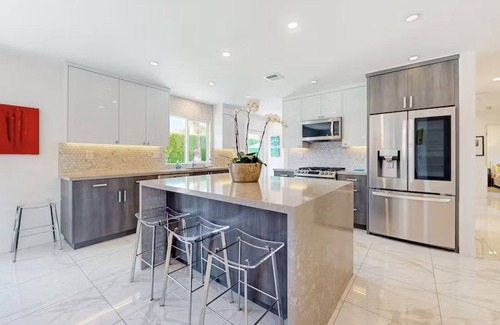 Enjoy a stylish experience at this mid-century, reimagined pool home in South Central Palm Springs. This brightly coloured, open concept 1800 square feet (168 square meters) of living and entertaining space on a peaceful 1/4 acre lot with sparkling pool and citrus trees . Fully renovated in 2021, with ceramic marble floors, spa like bath, and chef's kitchen. Tickle the ivories on the baby grand, or dine el fresco in the expansive private back yard. 12 minute walk to restaurants and shops. Bike trails connect at the end of the cul de sac. 6 minute drive from PSP airport, but quiet neighbourhood off the flight path. Wide sidewalks , no overhead powerlines to obstruct the spectacular views.