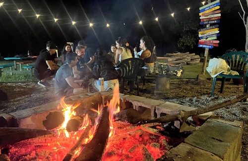 There are shared indoor bathrooms (showers not open yet) and an indoor common area with tables and seating, a phone charging station, pool and ping pong tables, lockers for valuables (BYO lock), and a fridge. There is a lit outdoor picnic and bonfire social space with yard games. There is WiFi and an onsite store coming soon.