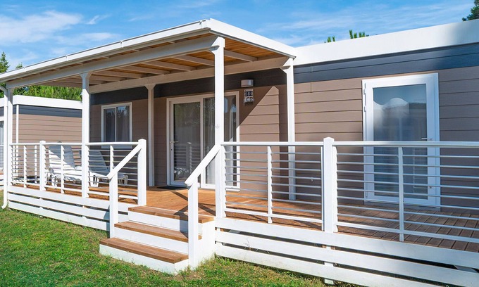 "Baia Elite", 4-room mobile home 33 m2. Modern furnishings: living/dining room with dining table and digital TV. 1 room with 1 french bed (140 cm). 2 rooms, each room with 2 beds (70 cm). Kitchenette (4 gas rings, freezer). Shower/WC, sep. WC. Air-conditioning, forced-air heating. Terrace partly roofed. Terrace furniture. Facilities: mosquito net. Parking (1 car) at the house. Please note: non-smokers only. Maximum 2 small pets/ dogs allowed. IT027044B1OWGM56Q6