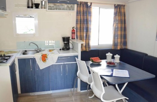 "Happy Plus", 4-room mobile home 32 m2. Comfortable furnishings: living/dining room with electric heating and air conditioning. 1 room with 1 french bed (140 cm, length 190 cm). 2 rooms, each room with 2 beds (70 cm, length 190 cm). Open kitchen (4 hot plates, microwave, freezer, electric coffee machine). Shower, sep. WC. Terrace partly roofed. Terrace furniture, electric barbecue (portable), deck chairs (2). Facilities: mosquito net. Parking (1 car) at 200 m. Please note: non-smokers only. Maximum 1 small pet/ dog allowed. IT049001B1AGBPI7WV