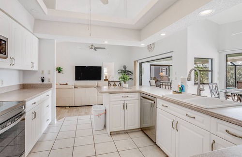 Want to stay closer to home? Pull up a chaise at the pool or bring your fishing rod and while away the afternoon on the dock, fishing for bass, tilapia, snook, or catfish in Pebble Beach Creek, just behind the home. In the evening, lots of good restaurants are nearby, or fire up the gas grill on the lanai. Pull up one of the swivel chairs around the firepit for after-dinner conversation, or get comfy on the sectional in front of the 75-inch smart TV, which features a Roku for streaming. Head off to a plush, pillowtop, reclining BeautyRest bed with one perfect vacation day behind you and another in store for tomorrow.