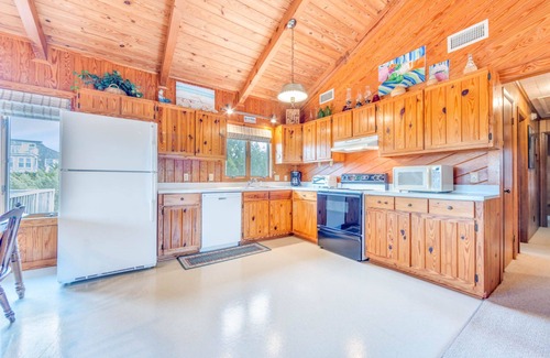 Inside you'll be welcomed by vaulted ceilings, with exposed beams and an open floor plan. WiFi and smart TVs throughout, surround sound stereo inside and on the screened porch. Settle into one of the three bedrooms, a master king sized bed with a private attached bath, second queen bedroom. The third bedroom includes two singles.