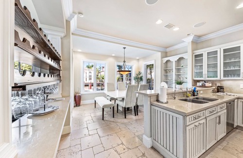 Spacious and well-equipped Gourmet Kitchen with top-of-the-line appliances and large Breakfast area. The open floor plan with large entry foyer includes a huge Great Room and large wet bar with wine fridge and soaring, beautifully appointed ceilings with custom trim throughout. Gigabyte WiFi and 9 all new large flat screen smart tvs help you keep up to date on the scores or enjoy movie night.
