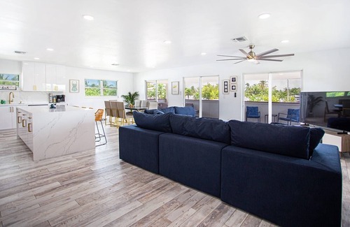 This beautiful 2,300 sq ft home 3/2 Rare waterfront private pool solid concrete block home located on Key West's Riviera canal with direct access to the gulf and ocean. Room for your boat on the 50 ft seawall, go to dinner by boat or just out for a cruise from the convenience of your back yard. Private pool to enjoy. The upstairs features an open floor plan with oversize kitchen, tons of natural lighting and endless palm tree views. The Home is fully equipped with kitchen needs, towels/beach towels, beach chairs, linens and more. The bedrooms are spacious and the master offers a nice sized walk in closet. Master room has a King bed and desk if needed for a work station. Bedroom #2 has 2 Queen beds and bedroom # 3 has 2 bunk beds (2 FULL Beds & 3 TWIN beds) The laundry is conveniently located upstairs. Step outside to enjoy your private backyard oasis with lush tropical landscaping. This home is designed for entertaining with over 600 sqft of covered outdoor living area, which hosts the large outdoor kitchen featuring granite counter tops. Downstairs you will find an 800 sqft game room with Foosball table, ping-pong table, basketball and More. We also have 3 bikes to use at your convenience to ride around town. This home is perfect to host families to build memories of a lifetime. Don't miss out on this rare opportunity to rent a waterfront home in Key West. Just a short 4 minute drive to the Famous Duval Street, Mallory Square, Key West Aquarium and more. Key west also has beautiful beaches Smathers Beach, Higgs Memorial Beach, our favorite Fort Zachary Taylor Historic State Park and more. So much to do in Key West from the best fishing, snorkeling/diving, jetskie and the list goes on.
