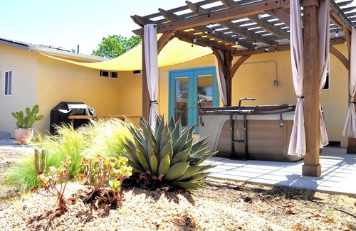 This beautifully appointed 2-bedroom, 2-bath home features a primary bedroom with a king bed, walk-in closet, ensuite bathroom with dual vanities, and direct yard access. Secondary bathroom with duel vanity. Enjoy an electric fireplace in the living room and a backyard with a pergola, Edison lights, hot tub, and BBQ. Each room has a smart TV, and and free electric vehicle charging is available. Unwind in modern amenities and embrace tranquility in wine country. Book now for an unforgettable experience!