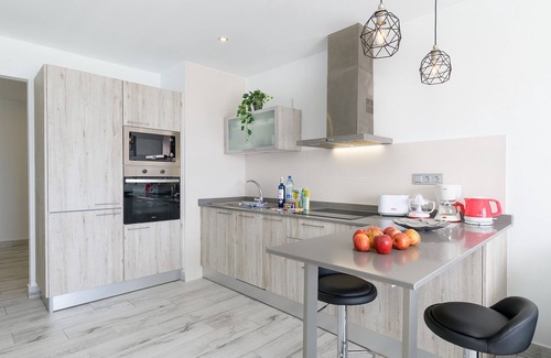 The bathroom includes a shower, hairdryer, magnifying mirror and quality toiletries (gel dispenser, shampoo and moisturising cream). The living room is spacious and features a TV with European and English channels, Wi-Fi, dining area and fully equipped kitchen.