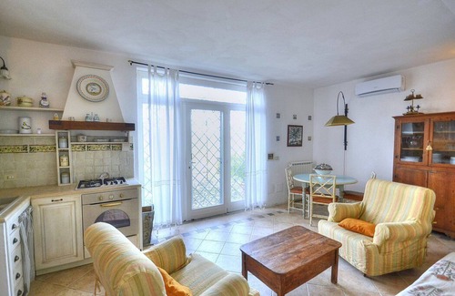 The living room is paved with terracotta tiles. The furnishings are cozy and comfortable. The furnishings include a sofa and two armchairs. In the living room you will also find a cooking area. The kitchenette is equipped with a four-burner gas cooker, a refrigerator with freezer and an Italian-style coffee-maker. The dining table can accommodate four guests. In this room you will find a flat-screen satellite television (local channels). From the living room you will be able to enter the patio through a French door. The room is equipped with an air conditioning/heating unit.