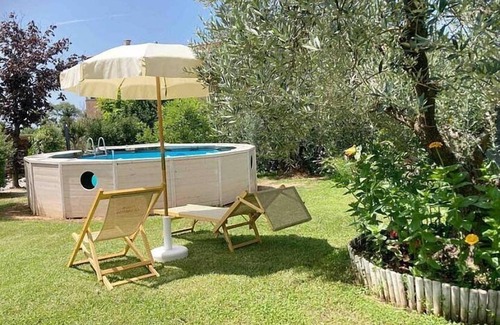 The above-ground swimming pool has a circular shape, has a diameter of 5 meters (16 feet) and is deep 1.3 meters (4.3 feet). The area is equipped with sun umbrellas, sun loungers and an external shower. From the swimming pool you will enjoy a broad view of the greenery. You will share the pool with guests staying at 2 other apartments. The swimming pool is open from the beginning of May until the end of September.