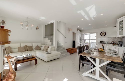 The ground floor consists of a spacious, open-plan living area. This is furnished with an elegant corner sofa, a dining table for 6 and a well-appointed fitted kitchen.The kitchen is fully equipped with a cooker hob, oven, dishwasher, microwave, filter coffee machine and fridge/freezer. Marble stairs lead up to the bedrooms.