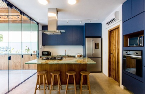 Wonderful house, newly built in a contemporary style with pool, leisure area with barbecue, 4 suites, TV room, in the best block - gated community - of Guaecá Beach, north coast of Sao Paulo. The house is 140m from the beach with access by a beautiful lawn. It has daily housekeeping service, complete layette with 400 thread count sheets. Beach tent service, tennis court and wonderful mountain views! Come meet!!!