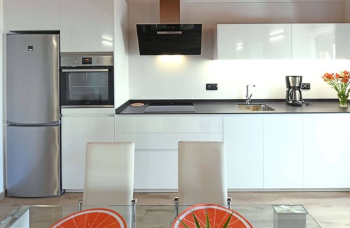 In the induction open plan kitchen, refrigerator, microwave, oven, freezer, washing machine, dishwasher, dishes/cutlery, kitchen utensils, coffee machine, toaster and kettle are provided.