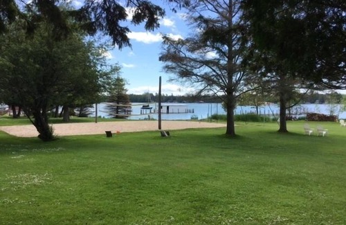 Spacious Yard, Sand Beach Volleyball Court, Basketball Court, Horseshoes, Swing Set: All cabin renters at LCL have access to 250 feet of waterfront, beach, docks, volleyball and basketball courts, horseshoes, swing set, and a spacious, well-maintained lawn area suitable for croquet, bocce ball, cornhole, or most any other yard game.