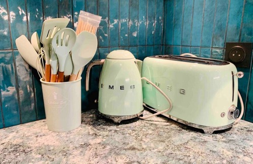 There is an open kitchen plan, next to the living room. The kitchen is completely equipped with everything you need for in home cooking, or a fondue at home with friends and family.