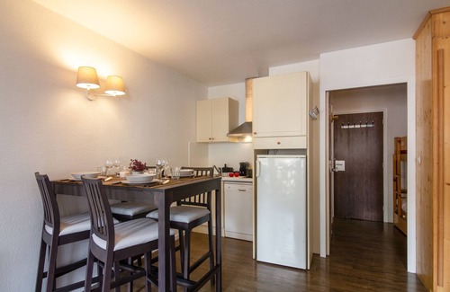 Conveniently placed in Chamonix Sud, this uplifting studio with flexible layout offers the perfect budget-friendly holiday base for couples and family groups of 4. Inside, the WiFi-enabled apartment benefits from a light and airy living space, furnished with a flat screen Smart-TV, modern double sofa bed and a dining area for 4, with accompanying kitchenette, complete with electric hob, dishwasher, fridge. The living room also leads out onto a mountain view balcony, which is furnished with a bistro dining set for 2. Accompanying the double sofa bed in the living room is a child-friendly set of bunk beds in the adjoining hallway. A contemporary-fitted bathroom with tub and overhead shower offers added convenience whilst away.