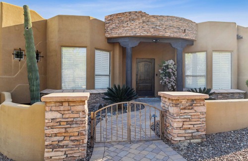 Several golf courses are available within 20 minutes from this home. This home only 30 minutes from the PHX airport and 45 minutes from the Mesa airport. Garage is not available for use and is used for the owners possessions. The garbage container sits behind the 4' stucco wall to the left of garage as you walk down the paver walkway to the back patio and pool area. The home also has a Savant stereo system throughout the entire home and pool/patio area. TV's are set up with streaming and apps via a Starlink internet. Verizon cell signal is weak and you need to connect to the wifi phone calling that is available throughout the property. If golf isn't your thing, there is a beautiful casino (We-Ko-Pa) 17 mins away. Their golf course is top notch and you need to plan ahead for tee times. You would also like the Sunridge course called the Wicked Six. Staying in this home will leave you with a memorable and relaxed experience. The name Fountain Hills comes from a water feature in the towns lake that spouts up 300-400' pperiodically during the day to early evening. Makes for a nice walk around the Lake and there are many restaurants once you are in town within walking distance of each other. If you enjoy walking nature trails.we have many around. In fact there are a couple trails you can walk too from this home. Pets are not allowed.