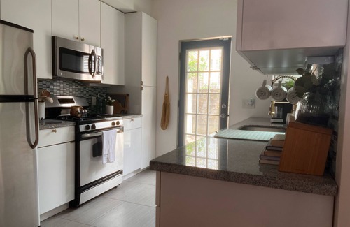 The living room invites you to relax with mid-century furnishings, plush textures, and artistic touches. The fully stocked kitchen comes equipped with everything you need — espresso machine, toaster, kettle, utensils, cookware — whether you’re whipping up a meal or savoring a slow morning coffee.