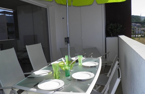 Holiday rentals in Sète: Lovely modern luxury apartment. 3 pieces. 68m2 on the ground floor in a recent residence. Beaches 750m away, shops 100m away with bakery at the foot of the residence. 2 bedrooms (one with 160cm bed, wardrobe and chest of drawers, the other with 2 twin beds and wardrobe). Terrace of approximately 9.10m2. Living room with corner sofa, TV (110 cm flat screen and DVD player and some self-service DVDs), table, chairs and sideboard; open fitted kitchen with 3-burner induction hob, mini-oven, microwave, dishwasher, fridge-freezer; Separate toilets; Bathroom (bathtub, vanity unit). Two underground parking spaces (2) including No. 202 and No. 203 and bicycle storage in the residence. Apartment with video alarm. You will be charmed! Pets not allowed. Late arrival possible: €50 (contact us for details). Apartment classified 3 stars.