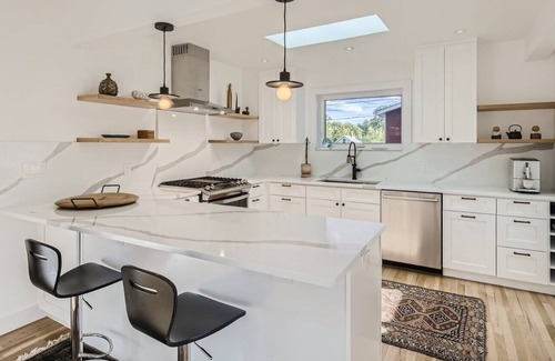 The living room has a gas fireplace. Second living space downstairs flat screen TV with subscriptions to HBO, Netflixs, Hulu and Xbox. Large modern open well stocked kitchen with all the appliances for cooking. It has two person bar style seating. Dining area with a table for six, extra leafs are available upon request. There is an office space with a desk that is remote controlled for standing. The office great for working remotely.