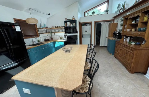 Kitchen is roomy with plenty of space to have conversations while preparing food. From the large dining table to the island with seating there is room for you all. You have everything from coffee to tea to hot chocolate in the cooler months. You can also enjoy bottled water with flavor packets and if that isn’t enough you can make full pitchers of lemonade or fruit punch!