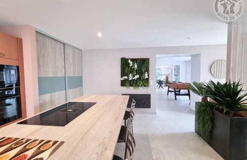 Entrance to the fully equipped kitchen (dishwasher, Tassimo capsule coffee maker, oven, microwave, 4-burner induction hob with integrated extractor hood, washing machine). Dining area.
