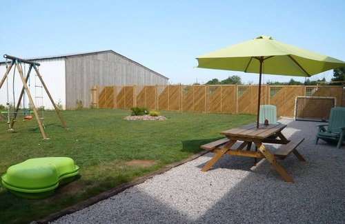 House adjoining the owner's house and another rental property. Living room. Kitchenette. Laundry area with toilet. Upstairs, bedroom 1 (1 double bed and a crib), bedroom 2 (2 single beds). Shower room. Toilet. TV. DVD player. Wi-Fi. Washing machine. Dishwasher. Baby equipment available. Single sofa bed. All utilities included. Beds made and towels provided. Cleaning service included. Private, south-facing enclosed garden at the rear. Shared enclosed courtyard at the front. Picnic table. Deckchairs. Barbecue. Swing set. Ping-pong table and trampoline for shared use. Shelter. Within this imposing farm building made of local stone, a comfortable cottage awaits you. A large outdoor area is available with games for the whole family to relax. This farm is ideally located between Ste Mère Eglise and the beach (Utach Beach is 7 km away).