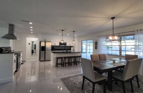 Your family will be close to everything when you stay at this centrally-located place. 15 minutes to Siesta Beach, 10 minutes to UTC mall, 15minutes to downtown, 20 minutes to SRQ airport. This home is fully remodeled July 2022, resurfaced pool October 2023, fully furnished, sleeps 8 -( 6 adults and 2 kids) . We have 1 king size bed in the master, 55" smart TV, sliding door to the pool. Walking closet, private full size bath with a walking shower, 2nd. bedroom has a queen bed with 55"smart TV, 3rd bedroom has a 1 full and 1 twin beds with 50" smart TV. This is open plan home with a big family room, 60" TV above electric fireplace, formal dining room seats 6 with the bar seats 4. We have big lanai with a table seating 8, big sofa, 2 chairs, 2 lounge chairs. BBQ Grill.The kitchen, with beautiful black granite counter tops, electric cooking range and oven, and fine wight wood cabinetry is stocked with all you will need to make up a fun vacation meal or prepare a sit-down gourmet delight. We have all new appliances. Lots of cabinets, and a big pantry. Garage converted to a play room, has AC and a ceiling fan, queen size futon, with a pool table, and other games. Pool is heated (for additional charge), salt water pool. Tile floors in the main areas and bathrooms, bedrooms has a laminate floors. Back yard is fully fanced. Laundry in the garage.