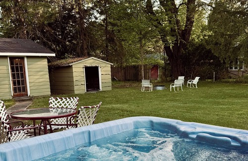 Warren Dunes Cottage: Chic 2 bed/1 bath with industrial & vintage flair. Just minutes from Warren Dunes (Lake Michigan)! Enjoy a hot tub, fire pit, & backyard loungers. Walk to wine bar & local market. A peaceful, central getaway that is perfect for any stay. Book today!