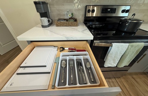 FULLY EQUIPPED KITCHEN: Cook with confidence in the open-concept kitchen, complete with a stove, microwave, dishwasher, and full-sized refrigerator, as well as cookware and small appliances like a Keurig coffee maker and toaster.