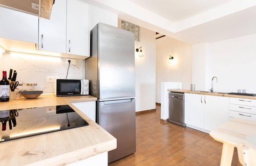 The kitchen is fully equipped, ready for you to prepare your favourite meals. There is also a washing machine on the balcony.