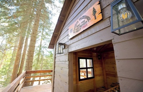 Cozy cabin in Ponderosa near waterfalls, trails, beautiful pond, and restaurant! Features treehouse and zipline!