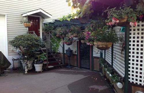 This Romantic getaway is a 5 minute walk to everything or a 3 minute drive to inner harbour. Newer home, 3 flat screen TVs & 4th at the hot tub. Shaw 500 internet, with blue Curve TV, amplifiers, cable, Blue tooth speakers for your cell phone music,. monitored 24/7 by ADT, new commercial sized laundry off kitchen. All stainless steel gas appliances under sunlit skylights. Separate shower & jacuzzi tub . (Both for two) . 2 Br 1 Ba, 1,100 sf. Air conditioned. Enjoy your breakfasts in a private garden under a Mediterranean styled vine covered grape arbour (You are the chef) or seat yourself in the sun at the covered outside bar in the secluded private lounging oarea with a private 2 person hot tub and sauna in the rear garden. Two private fern shaded swings will convert to private beds where you can spend your nights safely under the stars. . Very private unaccessible rear yard. (8-9 ft solid cedar fencing with 20 ft hedges. All centred in a safe warehouse area right in town. ( one block off Douglas.) Street is one block long and after 4:30 pm my pup chases balls on it , in the middle of the city.! Very quiet. Sleep soundly . Minutes walks to everything. Restaurants (dozen) , newest Uptown mall and food court. 10 minute walk( Walmart) , Tillicum mall: 15 minutes (6 cinemas), & largest Mayfair mall: 5 minutes. Canadian Legion and local pubs: A&W, Subway, Dennys. Tims, McDonalds , KFC, Wendy’s, red Lion, pizza shop all within 10 min walk or I will drive you and with a phone call, pick you up ( up to 10 pm ) or take a long walk (or bike )along the famous Galloping Goose Trail , (next door) where you can walk to Sooke or Sidney or until you are tired; then phone me and I will come and pick you up . Or, It’s only just a short 20 minute walk to a scenic waterfront pub style restaurant along the beautifully treed Galloping Goose Trail. Parking is off the street at your door; monitored on your phone. You really do Not need a car. 5 mins walk to bus. $2.50 bus fare takes you as far as Sydney or Sooke or $5.00 lets you ride all day. faster than your car. Retired Realtor (Estevan/Souris prairie boy) sometimes lives in separate suite. (You don't drink and drive in Victoria. First offence will cost you approx $4,300.00.) zero Tolerance here. Cab fare with tip $12.00 to inner harbour or 5 minutes by car. Also included are book shelves loaded with exceptional table top publications of rare and very interesting topics . You are not in a 'rental' unit here. You are in my home... minus my toothbrush. That's all I took when I moved out. Services with a smile, unmatched in Victoria at any price. Minimum stay 30 days with 50% discount