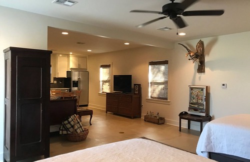 Our "Backyard Bungalow" has received rave reviews from our guests over the past three years, and now we are offering it as a stand-alone accommodation (earlier, it was only available to rent as an add-on if the main house was also rented). This 700 square foot cozy backyard cottage was completed in March of 2018. Located in a prime neighborhood of Bay St Louis, the property is a 2-block walk to the most expansive and pristine white-sand beach on The Bay, and is very convenient to old town Bay St. Louis shops, restaurants, and bars. The space can comfortably accommodate six guests and has it's own patio and outdoor seating area.