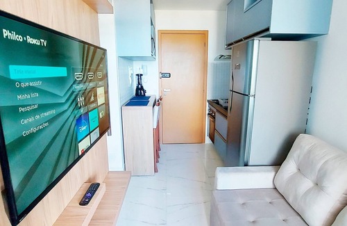 Bedroom and living room with sea view, new and well decorated in Costa Azul! With double bed, smart TV in the living room and bedroom, split air conditioning, sofa and full kitchen. Condominium with 24-hour doorman, gym, swimming pool, co-working and laundry (paid separately).