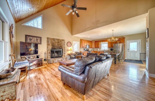 This spacious cabin provides four generously sized bedrooms and three-and-a-half bathrooms. As you enter the main level, you'll be greeted by a beautifully designed open-concept kitchen that seamlessly flows into the living room. The living room is a true highlight, characterized by its soaring high ceilings, thoughtfully arranged ample seating to comfortably accommodate your entire family, and a warm and inviting fireplace, perfect for cozy gatherings.