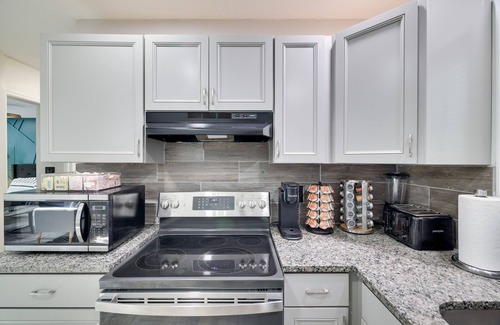 To the left of the fireplace we have a stand that has board games and playing cards to play on the dining table which is right next to it. The kitchen is fully equipped with all the essentials to cook with including seasoning. We provide K-Cups of Coffee, decaf and tea also. We do not provide any liquid creamers since we don't want guests sharing that. We do provide Splenda and Cane Sugar packets. By the dining table we have sliding doors which will lead you to the backyard that has a full patio deck, BBQ grill and outdoor seating. We also have have a fire pit in the backyard with seating.