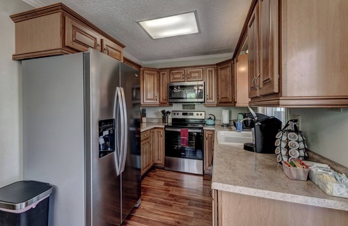 The kitchen is fully stocked with all the cookware and bakeware you need to make your standard meals and boasts a toaster and Keurig coffee maker with an initial stocking of K-cups, tea bags, creamer, and sugar/Splenda.