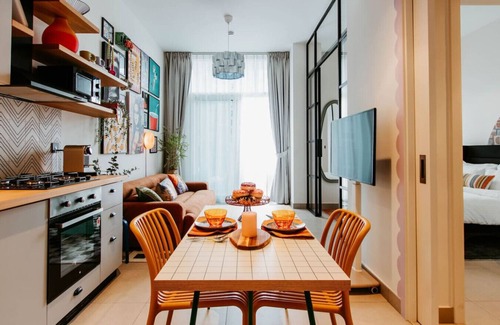 This one-bedroom apartment in Dubai Hills showcases a funky flair with bold and vibrant aesthetics 🎨✨. Unique patterns, creative furnishings, and bursts of lively colors 🎉 define the interior, fostering an energetic ambiance . The living space embraces an offbeat decor, incorporating playful elements like quirky artwork 🖼️, inventive lighting 💡 and distinct shapes 🔷. The bedroom continues the distinctive theme 🛏️ ensuring a memorable and dynamic living experience 🌟