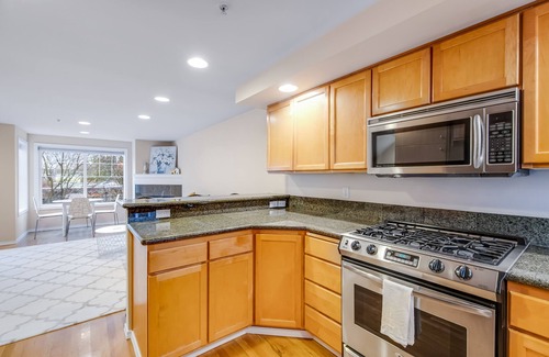 This spacious three-bedroom townhome in Ballard puts you right in the middle of the action, while still providing a tranquil escape from the city. Inside this bright, open, south- and west-facing corner home you'll find a space brimming with natural light. The main floor features hardwood floors, a gas fireplace with a granite hearth and surround, and a private deck. The chef in the group will love the full kitchen, with granite counters, plentiful cabinets and a full suite of appliances, including a gas stove. Dine together in the sunny window alcove at a table set for four.