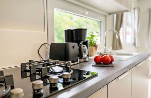 "Tiny Haus Vierseenblick Nummer 4", 3-room mobile home 40 m2, on the ground floor. Beautiful and cosy furnishings: living/dining room with dining nook. 1 room with 2 beds (80 cm, length 190 cm). 1 room with 1 double bed (160 cm, length 200 cm). Small, open kitchen (oven, Gas stove, 4 gas rings, toaster, kettle, microwave, freezer, electric coffee machine). Shower/WC. Electric heating. Terrace partly roofed. Terrace furniture. Parking (1 car) at the house. Please note: non-smoking house. Maximum 1 pet/ dog allowed. Smoke alarm.