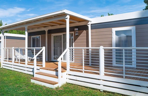 The mobile home is well-equipped with amenities to ensure a comfortable vacation. It has a shower, separate toilet, air-conditioning, and forced-air heating. Additionally, a small roofed terrace with terrace furniture is provided for your enjoyment. Mosquito nets are available, and reserved parking for one car is included at the property. The mobile home accommodates a maximum capacity of four guests.
