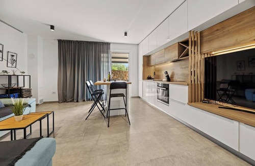 Apartment consists of a modernly decorated open spaced living room with kitchen, one bedroom, one bathroom and a terrace with jacuzzi and lounge area.