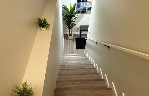Welcome to your Eastbrook cozy basement-step through the staircase nook, kick shoes off on the cushioned bench, hang your coat on the handy rack, then sink into our Tempur-Pedic queen mattress that molds like zero gravity. Pull-out sofa flips out for two more, so four fit easy. Full kitchen’s no joke: dishwasher, four-burner stove with range hood. Toss laundry in the washer while you chill. Whole space feels huggy-warm, no clunky stuff in sight. Wi-Fi, TV, all that. Perfect hideout.