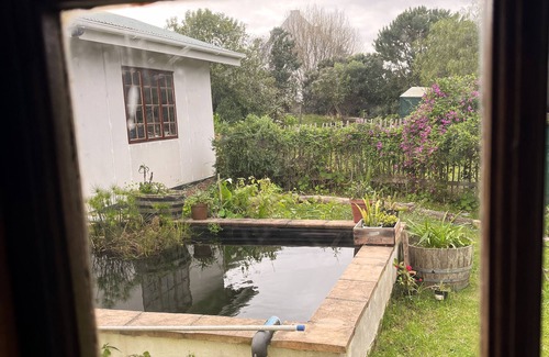 The flat is on the bottom floor in a lovely farm-style house, with a wood stove, cozy/sunny stoep, and a view onto a natural plunge pool and lush garden. The garden has all sorts of herbs and vegetables that you would be welcome to enjoy.