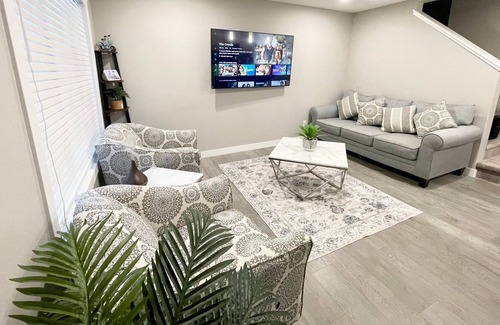 Upon entrance through side glass door, you will see a larger foyer with closet. On main floor, you will see half washer, fully upgraded kitchen, dining area, spacious living room with 65 inch TV. On second floor you will get access to one bedroom with queen size bed, full washroom with tub, laundry, and flex area with treadmill.