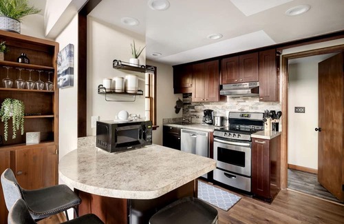 Our updated, fully stocked kitchen has plenty of prep space and bar seating for two. Just off the kitchen is the dining area with seating for 4, and a spacious living area. Cozy up by the fireplace or host a family game night.